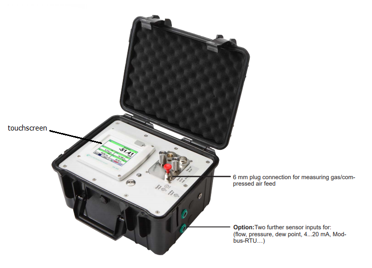 Máy đo điểm sương di động tích hợp pin sạc đã được phát triển đặc biệt cho mục đích sử dụng ngoài trời. Bên cạnh cảm biến điểm sương có độ chính xác cao, thiết bị còn tích hợp cảm biến áp suất chính xác lên đến 16 bar. Vì vậy, ngoài đo độ điểm sương tính bằng ° Ctd, nhiệt độ tính bằng ° C và áp suất dòng bằng bar cũng có thêm các thông số độ ẩm (% RH, mg / m3, g / m3) cũng như các giá trị đo phụ thuộc áp suất (g / kg , ppm v / v, atm. điểm sương ° C) có thể được tính toán.